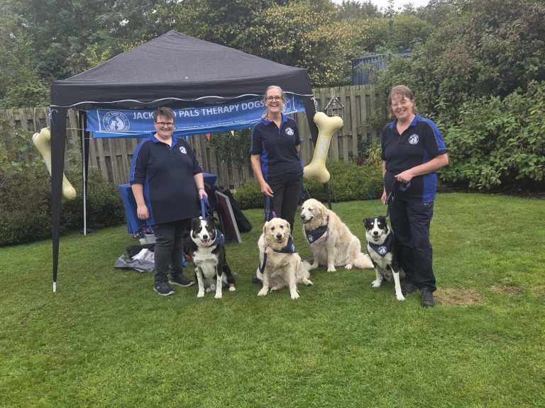 Between them, they have five border collies and two gold retrievers, but of course we accept any breed of dog with a suitable temperament into Jack and Pals Therapy Dogs. Wendy has been involved with therapy dog visiting for over ten years and Faye has experience of therapy dog visiting with her dog Tom who is also a full working farm dog. Mike has owned dogs for many years and knows what makes a top class therapy dog. Maria has visited with her golden girls for many years.